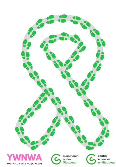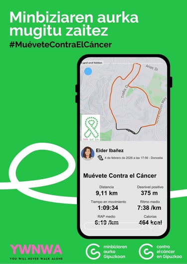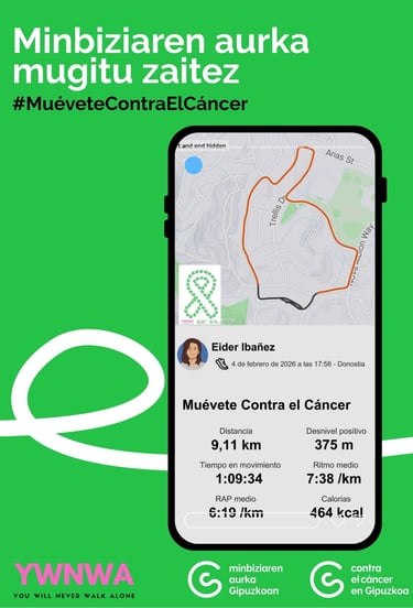 Comparte la actividad en una historia de instagram con el hashtag #MueveteContraElCancer junto con la imagen del lacito y menciona a @contraelcancer.gipuzkoa y @youwillneverwalkalone26